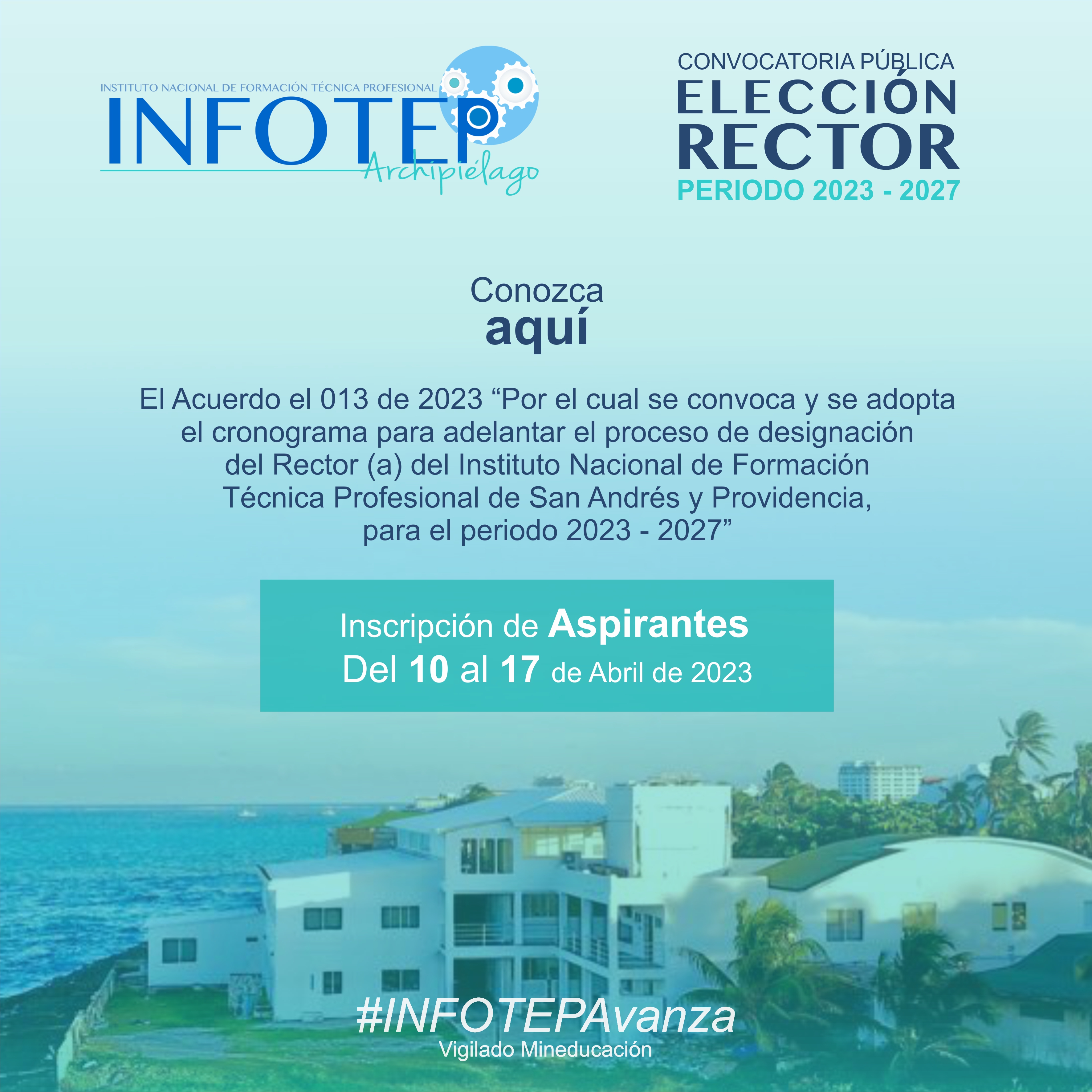 El Instituto Nacional de Formación Técnica Profesional de San Andrés y Providencia (INFOTEP) se permite poner en conocimiento de la ciudadanía la Convocatoria Docente Catedráticos y Ocasionales 2023-I, dando clic en los documentos relacionados podrá consultar los términos de referencia y cronograma de la convocatoria.
