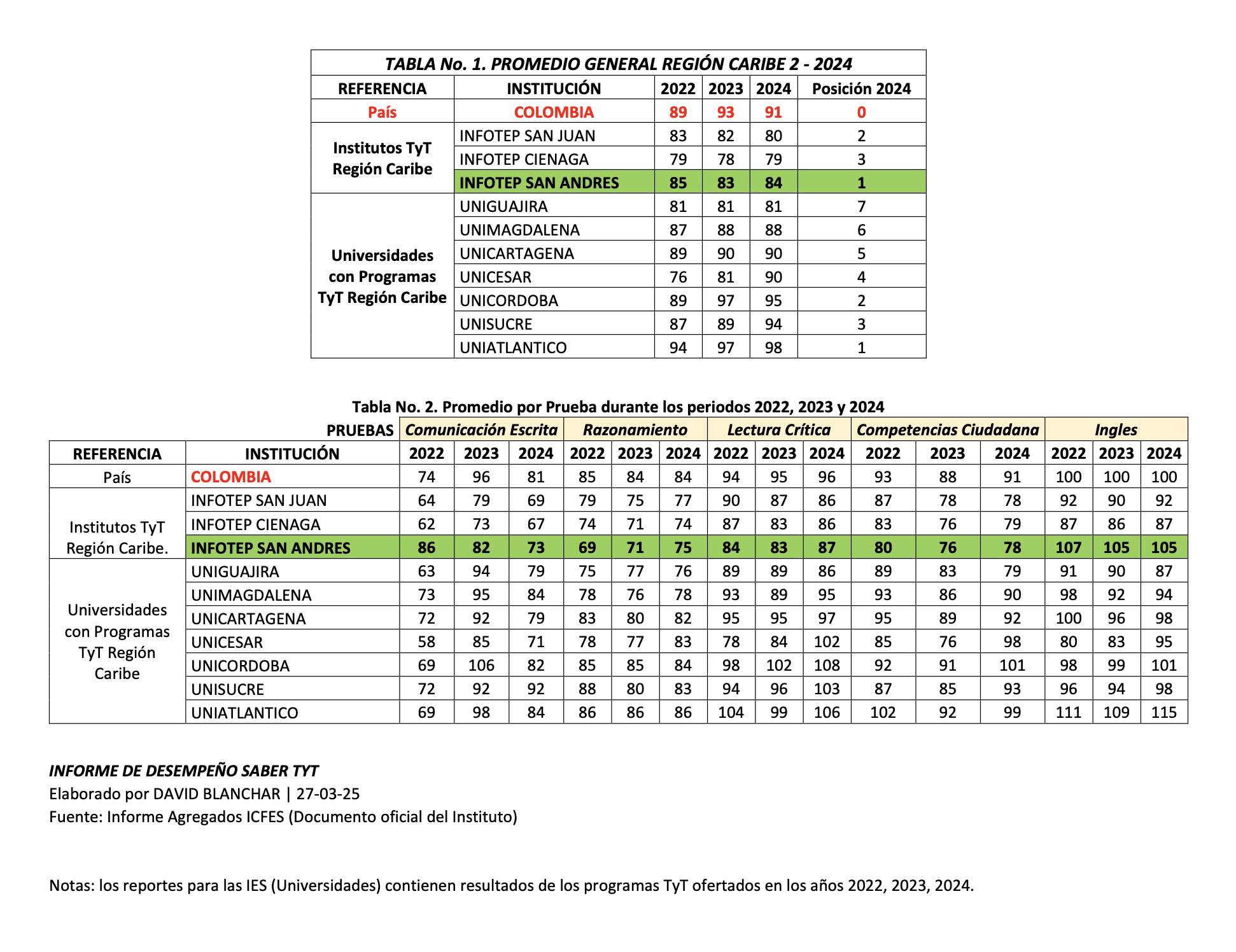 Este resultado es el reflejo del desempeño acumulado en las dos aplicaciones de la prueba durante el año 2024, lo que demuestra la consistencia académica y el alto nivel de preparación de sus estudiantes. Con un puntaje promedio de 84 puntos sobre 100, INFOTEP San Andrés se posiciona en el primer lugar entre los institutos TyT de la región, superando a INFOTEP San Juan (80) e INFOTEP Ciénaga (79). Además, sus resultados destacan incluso frente a universidades que ofrecen programas tecnológicos, superando ampliamente a la Universidad de La Guajira (81) y acercándose a los promedios de la Universidad del Magdalena (88).