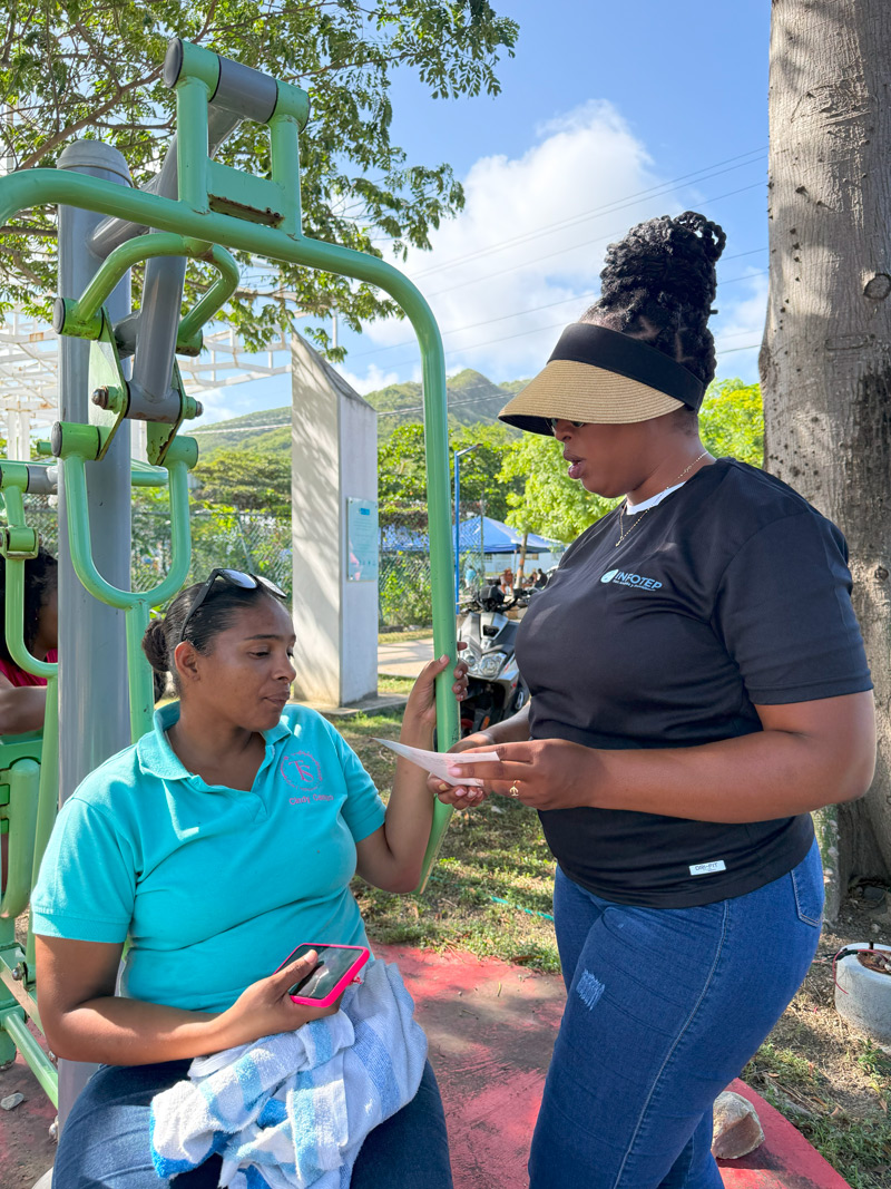 El primer día de la visita, INFOTEP realizó una jornada institucional informativa con el objetivo de socializar procesos clave como la matrícula para el próximo semestre y reforzar el vínculo con la comunidad estudiantil. Así mismo, se entregaron kits de bienestar que incluyeron impermeables, souvenirs y elementos personales y deportivas para hombres y mujeres. De manera especial, se ofreció atención personalizada a dos estudiantes en estado de embarazo. Desde el área de Bienestar se llevó a cabo una jornada de salud básica y prevención, con toma de presión arterial, medición de azúcar, pruebas de VIH, entre otros servicios. También se realizaron pausas activas, actividades rompehielos y dinámicas integradoras en el marco de las sesiones de clase.