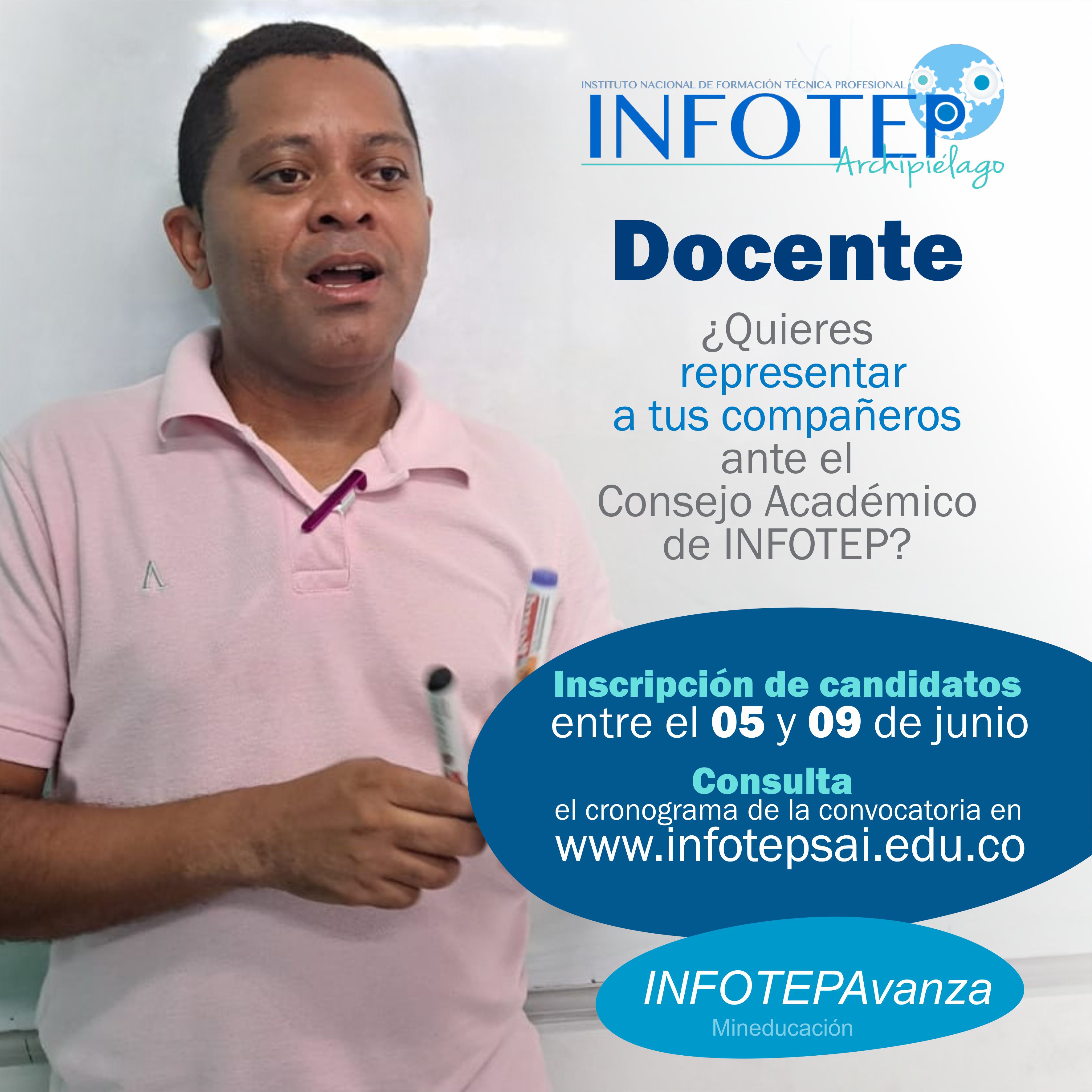 San Andrés Islas, 29 de mayo de 2023. – A través de un proceso electoral estudiantes de INFOTEP elegirán a su representante ante el Consejo Académico, en este sentido, mediante el Acuerdo No. 005 de 2023, el Consejo Académico del Instituto Nacional de Formación Técnica Profesional INFOTEP, en ejercicio de sus atribuciones legales inicia el proceso para elegir a los Representantes de los Estudiantes mediante la presente convocatoria.