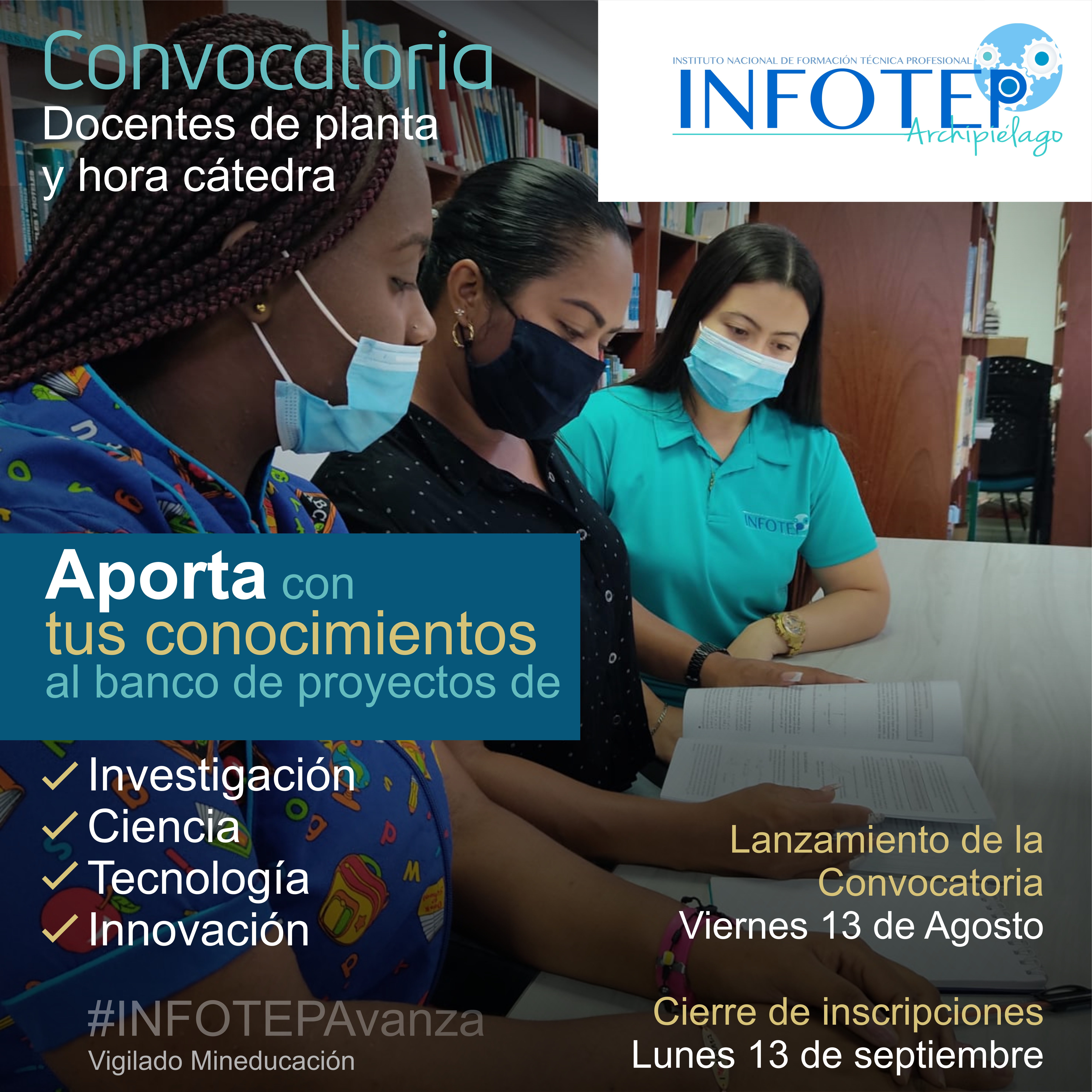 San Andrés Islas, 12 de agosto de 2021. – Con el propósito de crear, por primera vez, el Banco de Proyectos de Investigación de INFOTEP, a través del cual se pueden financiar proyectos acordes a las líneas y sublineas de investigación del Instituto, las directivas abren la convocatoria No. 001 de 2021, la cual permite que docentes de planta y hora catedra de INFOTEP integren este equipo con el cual se logrará el fortalecimiento, la generación, producción, gestión y aplicación de conocimientos que contribuyan al desarrollo curricular de la institución.