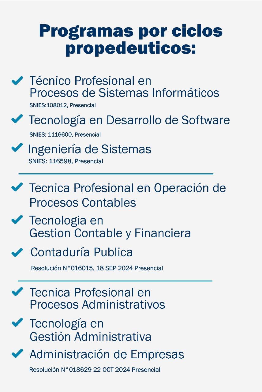 Los programas ofertados cuentan con la aprobación del Ministerio de Educación Nacional, garantizando calidad y pertinencia en la formación académica, destacándose la reciente aprobación de Contaduría Pública bajo la Resolución No. 016015 del 18 de septiembre de 2024.