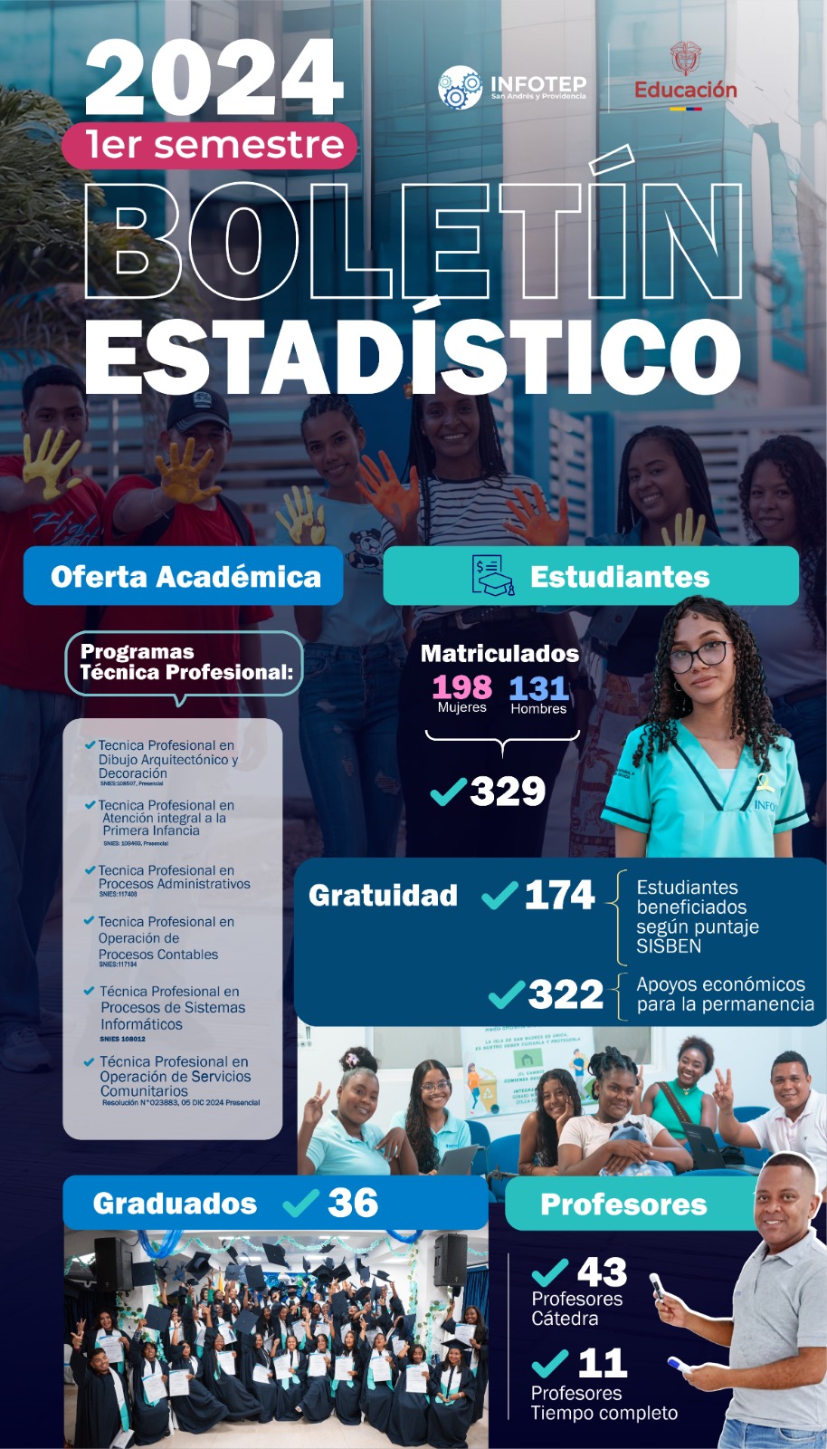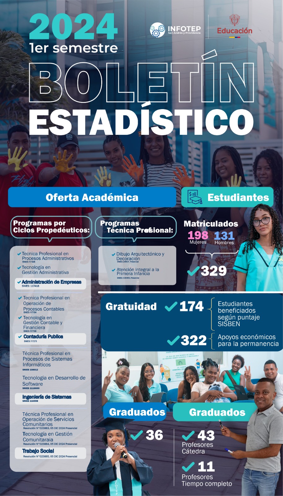 En este espacio se publica los Boletines estadísticas del Instituto Nacional de Formación Técnico Profesional de San Andrés y Providencia Islas INFOTEP SAI con fines informativos de la institución, los cuales recopilan los datos de las actividades académicas y administrativas.