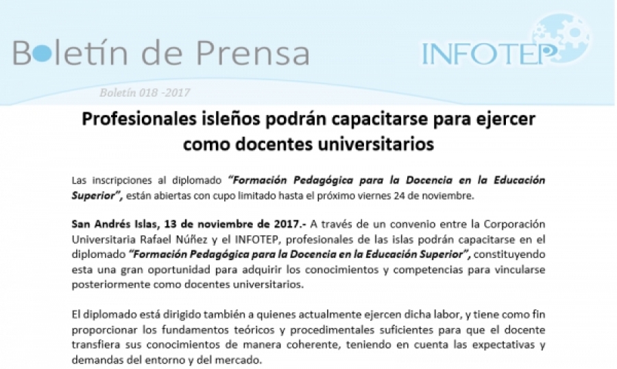 San Andrés Islas, 13 de noviembre de 2017.- A través de un convenio entre la Corporación Universitaria Rafael Núñez y el INFOTEP, profesionales de las islas podrán capacitarse en el diplomado “Formación Pedagógica para la Docencia en la Educación Superior”, constituyendo esta una gran oportunidad para adquirir los conocimientos y competencias para vincularse posteriormente como docentes universitarios.